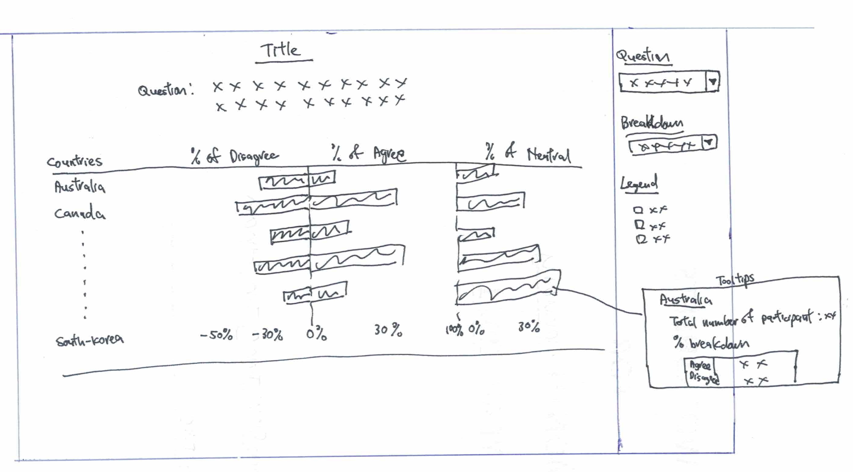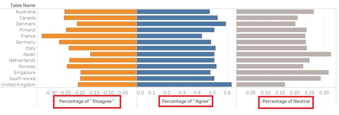 | 4. | The left chart was sorted based on country while the right chart was sorted based on percentage of “strongly agreed”. Is hard for reader to match the result for the two charts. Moreover, the information presented in the right chart could be found in the left as well. Is redundant to show the information again (Waste of space). | Do not repeat information presented. |