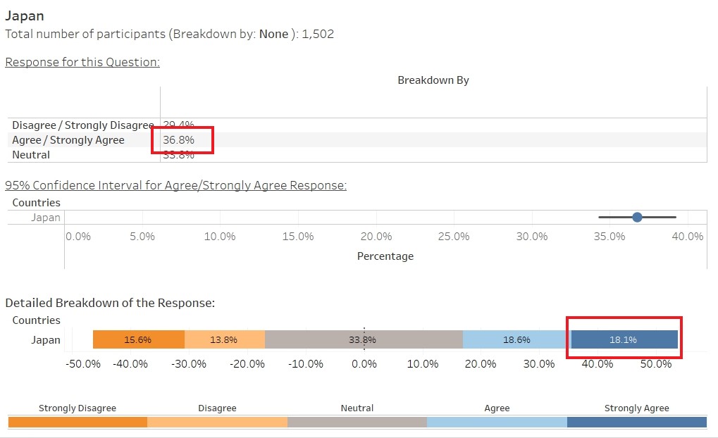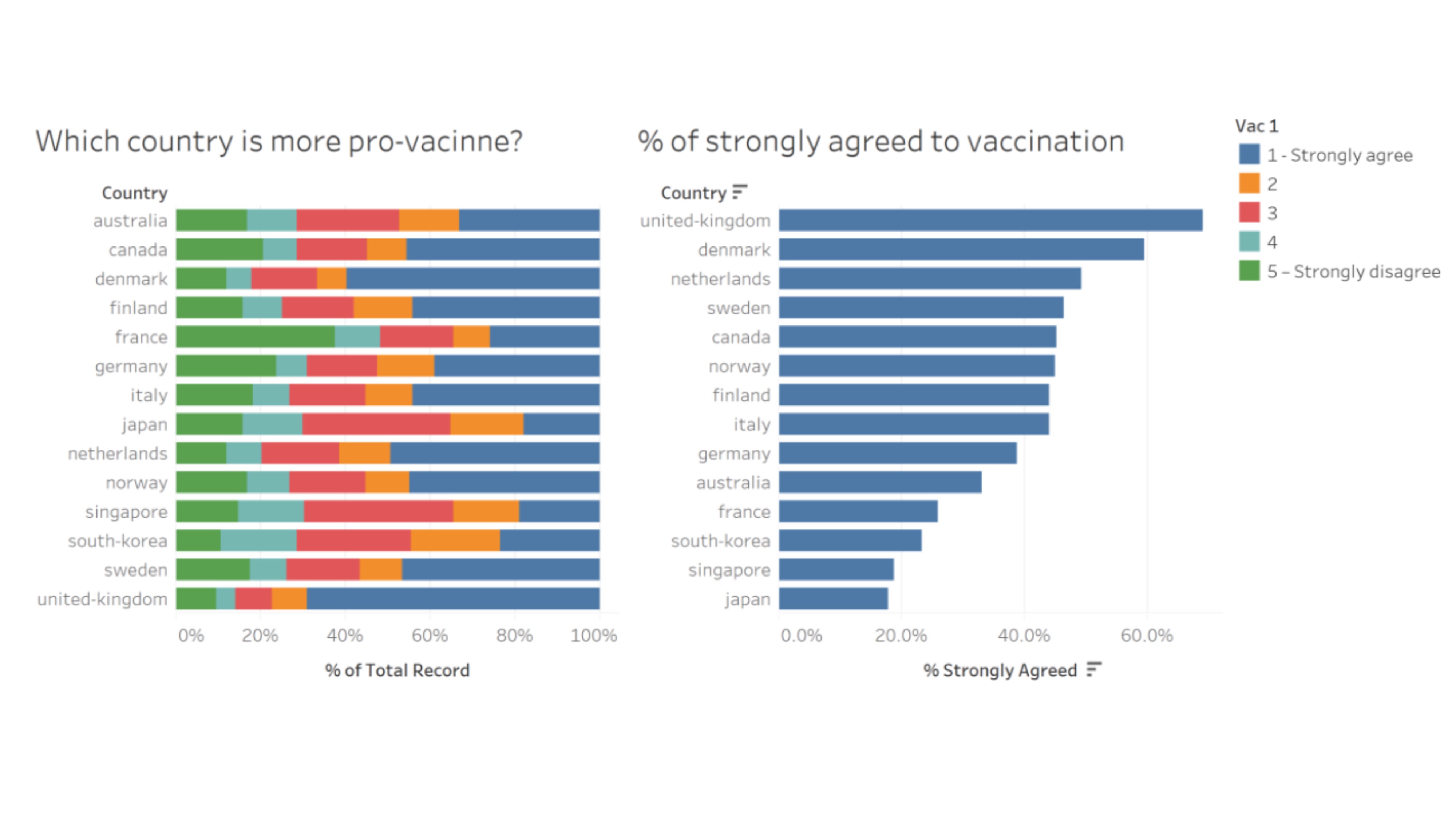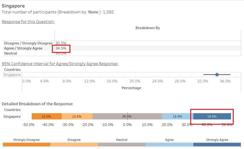 Based on the data visualisation for the question: “If a Covid-19 vaccine were made available to me this week, i would definitely get it.”, Singapore have the lowest Percentage of Agree/Strongly Agree (34.5%). However, if only look at Strongly Agree, Japan has the lowest percentage (18.1%). There is a need to determine how to interpret the data for agree and strongly agree (similarly, for disagree and strongly disagree) as it will affect the overall interpretation of the data.
