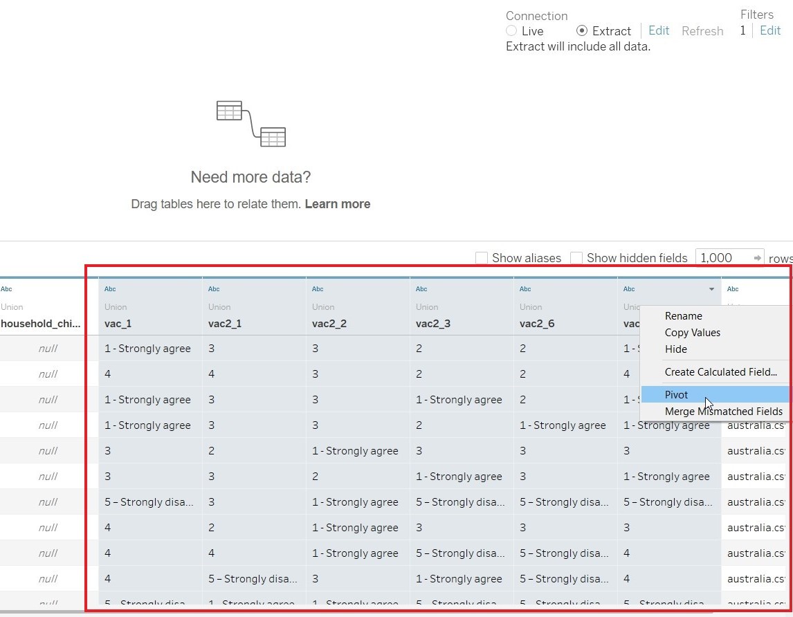 6. Select (vac1, vac2_1, vac2_2, vac2_3, vac2_6 and vac3) and pivot the data, for ease of processing subsequently.