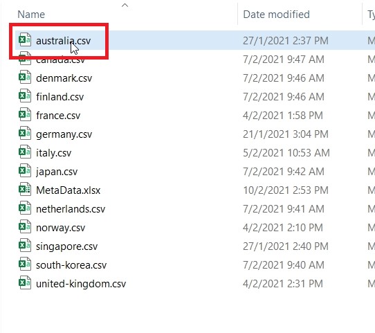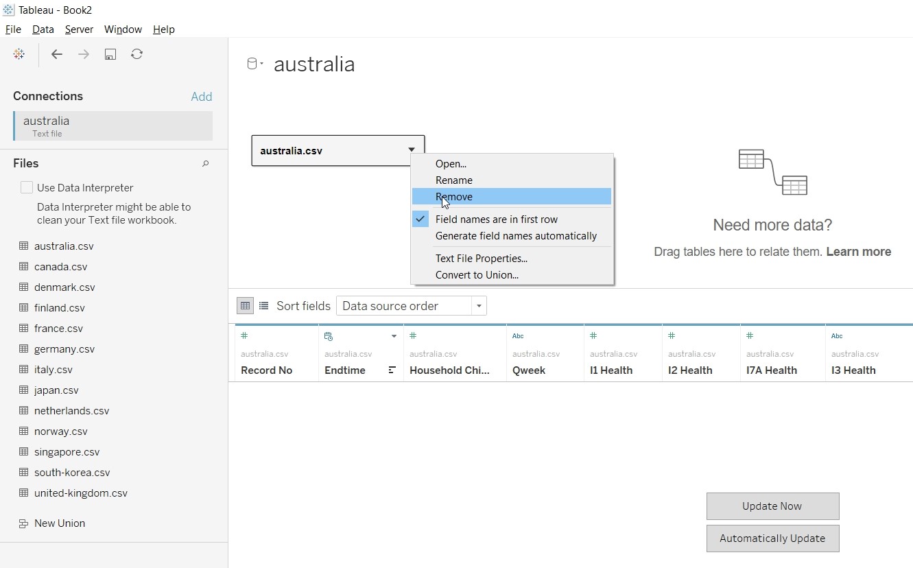 4. Save the file and repeat it for the rest of the countries (Norway, Denmark and Sweden). 5. For Sweden, there is a need to rename “record” to “RecordNo”, to align to rest of the dataset.