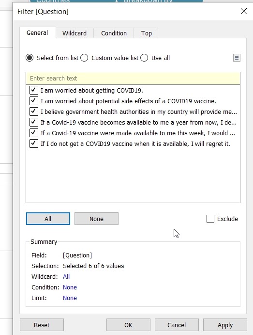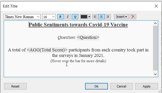 | 2. | The chart was derived from the survey question “If a Covid-19 vaccine were made available to me this week, I would definitely get it:”. This question does not imply that the individuals are pro-vaccine. There are other similar questions (e.g: “If I do not get a COVID19 vaccine when it is available, I will regret it”) but the results were not used. The result might not be representative and will be misleading to the reader. | To change the title of the graph or include the question to provide clarity. |