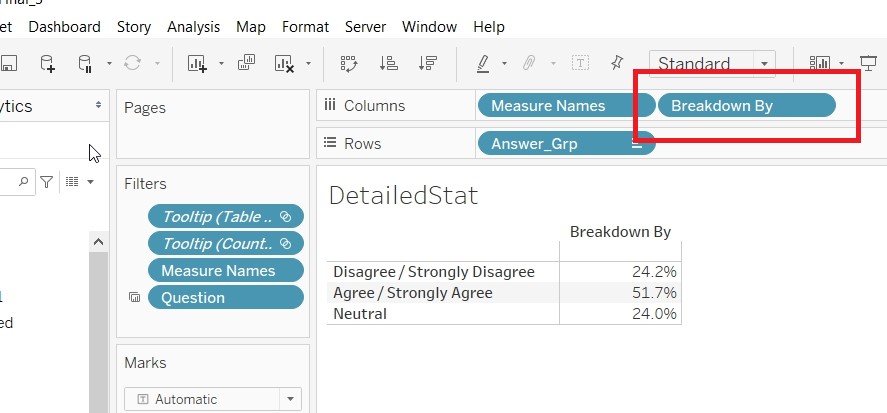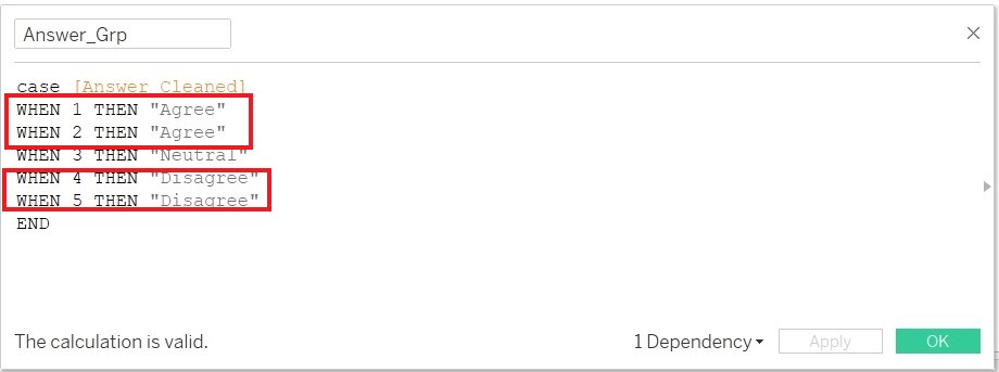16. Convert the response from 5 scale to 3 scale value (Agree/Strongly Agree, Disagree/Strongly Disagree) by duplicating”Answer_Cleaned" and edit the formula. Save the edited formula as Answer_Grp.