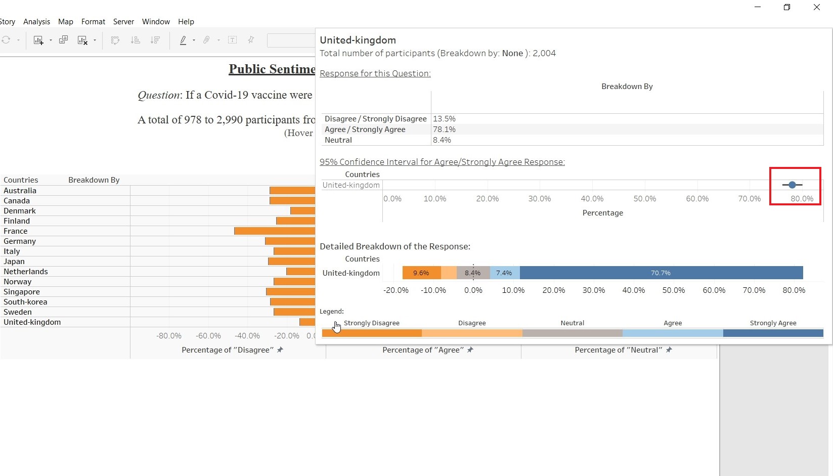 For all the vaccine-related questions (except “I am worried about getting Covid19” and “I am worried about the potential side effects of a Covid19 vaccine”), participants from United-Kingdom and Denmark constantly had the highest percentage of Agree/Strongly Agree and lowest percentage of Disagree/Strongly Disagree across the different questions related to Covid-19 vaccine. The two countries also had the narrowest interval between the upper and lower limit, indicating that the result are precised and less uncertainty. Figure shows result for one of the questions.