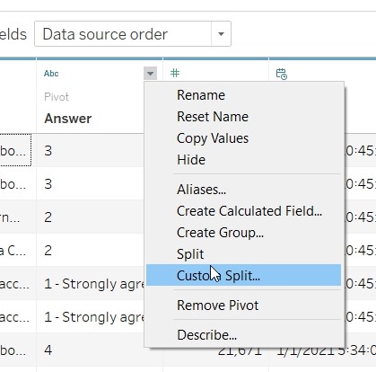 9. As the “Answer” value consist of a mix of character and numeric data, need to remove all the characters information. Click on “Custom Split” at “Answer”