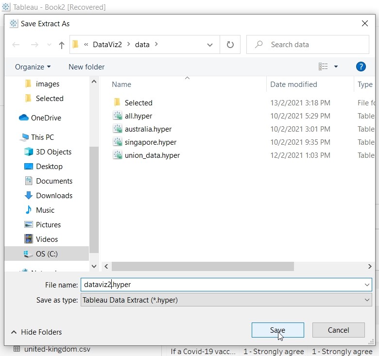 1. Click on “Sheet 1” and save the data as “dataviz2.hyer”