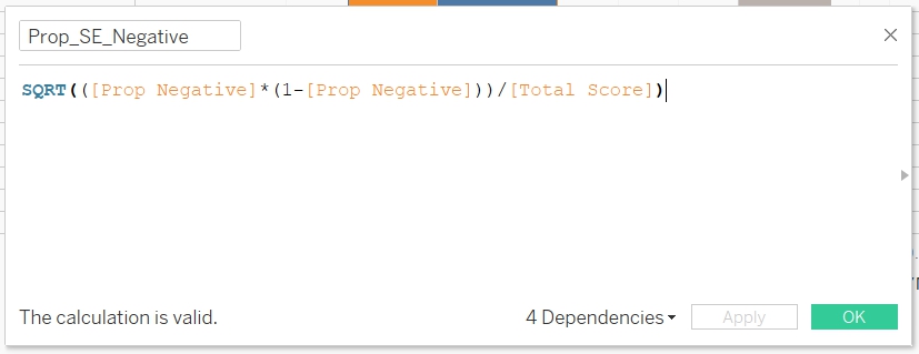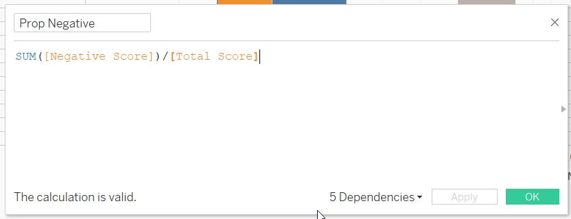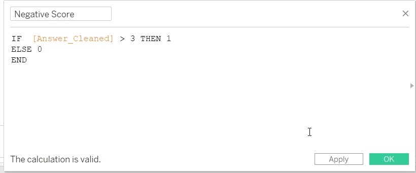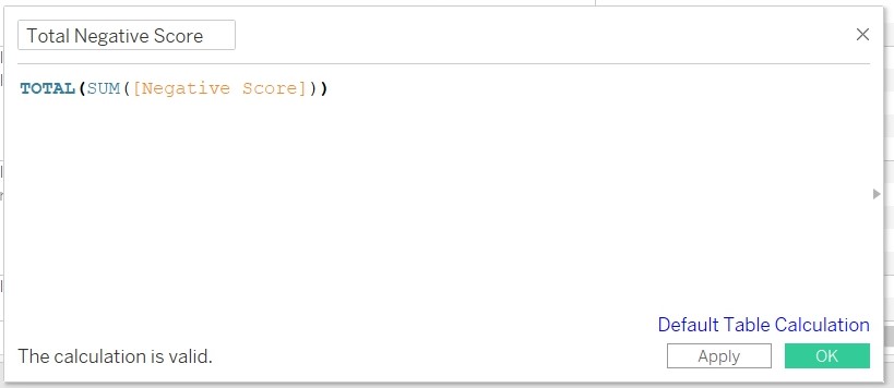 5. Count the number of Negative score by creating the Calculated Field “Total Negative Score”.