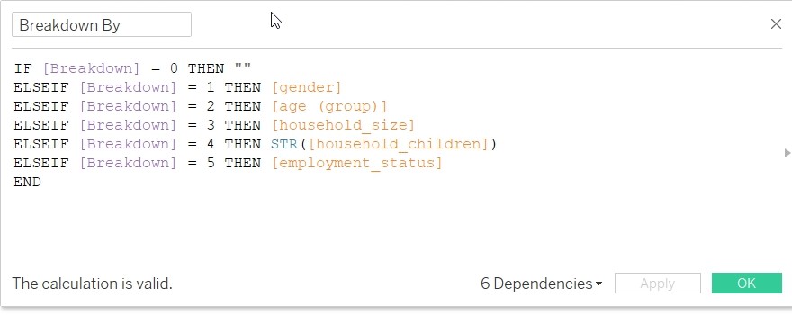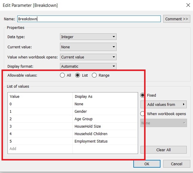 23. To provide reader with the option of breaking down the data into different categories, Create Parameter “Breakdown”.